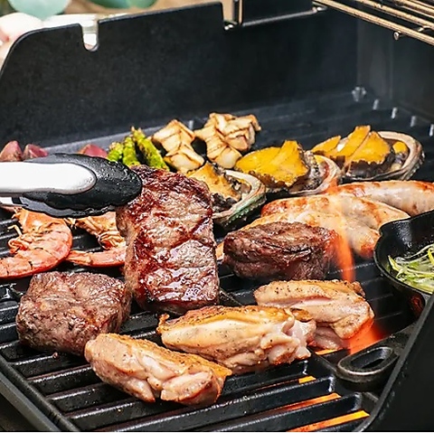 グリーンサラダのレモンドレッシング ~仕上げはパルミジャーノをお好みで~(パルミジャーノ・レッジャーノはお客様ご自身で削ってトッピングいただけます)ポテトフライ 真鰯と九条ネギ、ミニトマトの生姜アヒージョ【魚介のグリル】海老/蝦夷鮑【肉のグリル】/三河赤鶏のモモ肉/.豚肩ロース/牛タン/和牛サーロイン/サルシッチャ/【グリル野菜】季節の野菜 6種/【その他】バケット/焼きマシュマロ サヴォイアルディ付