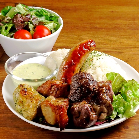シュラスコ専用マシンで焼き上げたビーフ・チキン・ポーク等の様々なお肉が一度に味わえるプレート。ライス(大盛り無料)・ミニサラダ・スープ(お代わり自由)がセットとなっております。