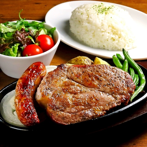 じっくりローストしたポークを厚切りにカットし、しっとり柔らかく焼き上げます。特性ソースとの相性も抜群です。ライス(大盛り無料)・ミニサラダ・スープ(お代わり自由)がセットとなっております。
