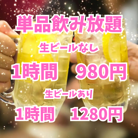 当日OK!単品飲み放題!生あり 1時間 1,408円(税込)/生なし 1,078円(税込)