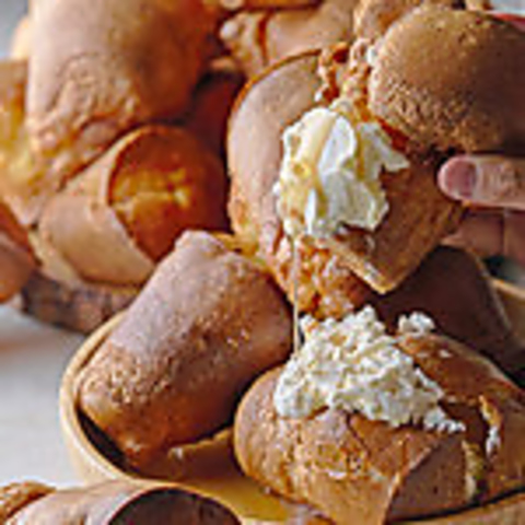 ポップオーバー(popover)とは、アメリカ発祥焼き菓子です。外側はパリッと香ばしく、内側は空洞ができていて、もちもち・しっとりとした食感が特徴です。塩ホイップクリームとメープルシロップ2種類のトッピングとも、他のお料理とも相性抜群です♪