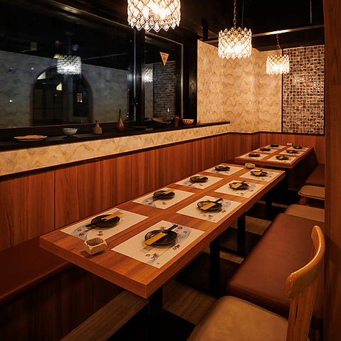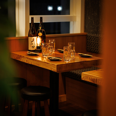 温かみのある照明が灯る落ち着いたテーブル個室。2~4名様でのご利用に最適な空間です。デートや女子会、気軽な飲み会にもぴったり。周囲を気にせず、ゆったりと食事と会話を楽しめます。上質な木の温もりに包まれたプライベートなひとときをどうぞ。