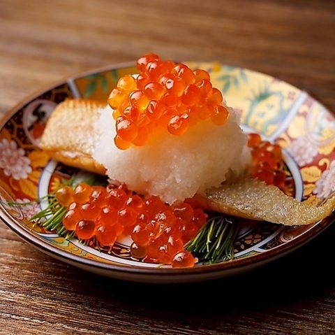 脂のり抜群の鮭ハラスを香ばしく焼き上げ、さっぱりとした大根おろしと贅沢ないくらをたっぷりと添えた一品。とろけるような鮭の旨味と、ぷちぷち食感のいくら、大根おろしの清涼感が絶妙に調和します。見た目にも華やかで、お酒のお供にもぴったりな贅沢なおつまみです。