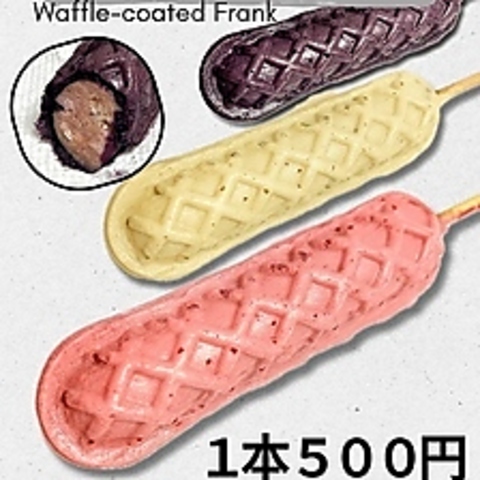 珍しいワッフル風フランクは、サクッとふわふわの新食感♪片手で気軽に食べられるので、街歩きの途中の小腹満たしに最適です◎フランクフルトも人気!