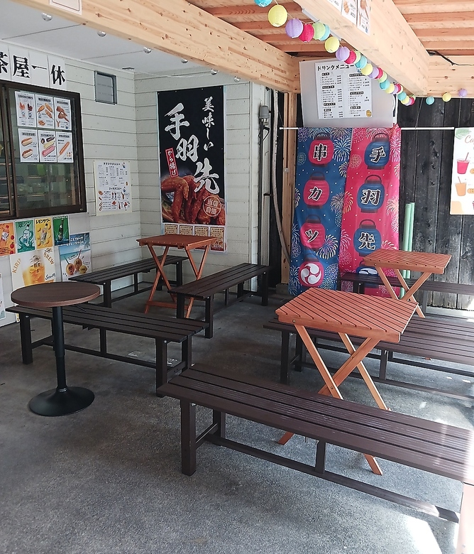 カウンターで注文後、すぐに広々としたベンチ席で休憩できるのが最大の魅力◎カラフルな飾りが軒先を彩り、まるで縁日のような明るい雰囲気です♪グループでもゆったり座れ、次の目的地を決める作戦会議にもぴったり!