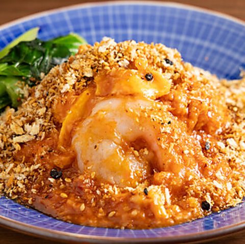 当店三大名物のひとつ「エビチリ金沙粉がけ」は、彩り豊かな海老チリにサクサクの金沙粉を贅沢にまぶした一品です。ぷりぷりの大きな海老と、香ばしくスパイシーな粉の食感が絶妙に絡み合う、一度食べたら忘れられない当店オリジナルの新感覚海老チリです♪