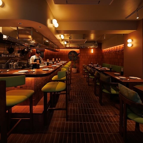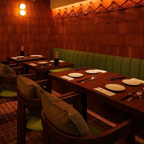 レンガ調の壁と温かみのある照明、深緑のソファと椅子が調和した空間で、ゆったりとくつろぎながらお食事を楽しめます。モダンでありながらも居心地の良い落ち着いた雰囲気を演出しており、カップルのデートや友人との食事に最適です◎