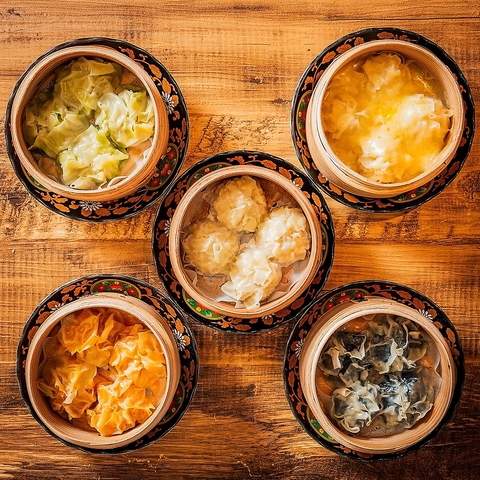 色とりどりの五種焼売。素材の旨みを生かし、一口ごとに違う味わいを楽しめる華やかな一皿です。ぜひどうぞ