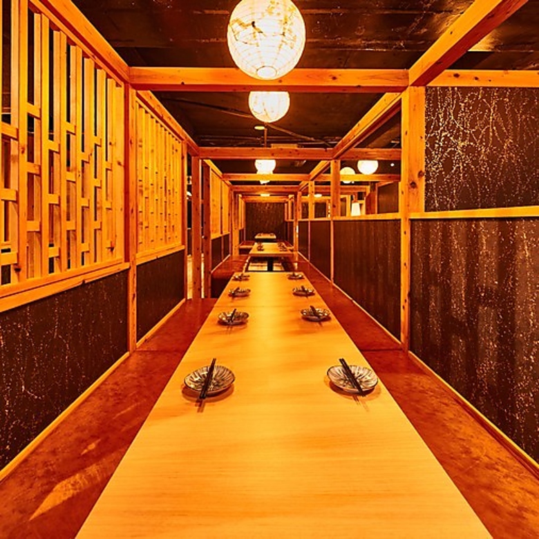 和の趣が溢れる落ち着いた空間には、大小様々な完全個室をご用意しています。障子を閉めると、プライベート感のある空間の完成。ご利用人数に合わせて仕切板や障子を全て取り外すと、梁だけを残した大きな個室になります。50名様から貸切にすることが可能なので、最大60名様まで大型宴会におすすめです。