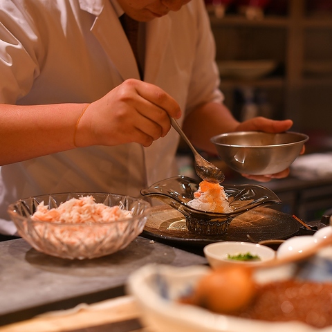 カウンター席で職人の手仕事を間近に。松葉ガニを贅沢に楽しむ、デートや記念日にぴったりのひととき。
