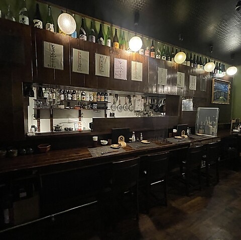 【落ち着いた空間の特等席】温かみのある木目調で統一されたカウンター席は、まさに特等席です。落ち着いた照明と頭上に並べられた酒瓶が、しっとりとした大人の雰囲気を醸し出しています。目の前にはオープンキッチンがあり、料理人の丁寧な仕事や調理の活気を感じながら、出来立ての逸品を味わうことができます。