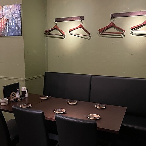 【大人の隠れ家のような落ち着いた空間】深みのあるグリーンを基調とした壁と、落ち着いた木目調のインテリアで統一された店内は、ゆったりとくつろげる雰囲気です。モダンな絵画や間接照明が、心地よい時間と「オシャレな空間」を演出します。広々としたテーブル席で、周りを気にせずお食事を楽しめます。