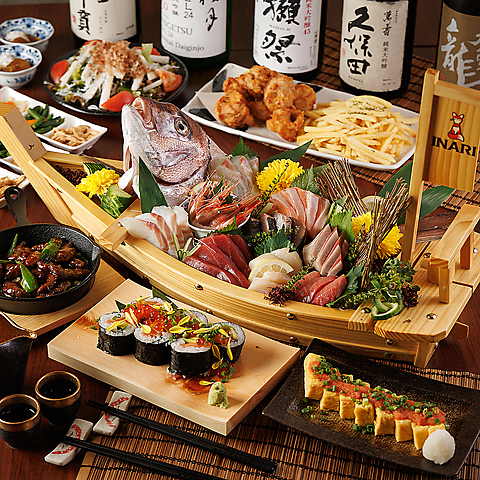 豪華食材のオンパレード!質・量ともに究極を追求した、最上級のおもてなしコースです。鮮魚7種舟盛りに、サーロインステーキ、香ばしい鮮魚かま塩焼きなど逸品が勢揃い。揚げ物は贅沢なタコキャベツカツ!もちろん名物地鶏焼鳥も堪能できます。〆は海鮮こぼれ盛り寿司で大満足。特別な記念日や大切な接待に最高の華を添えます。