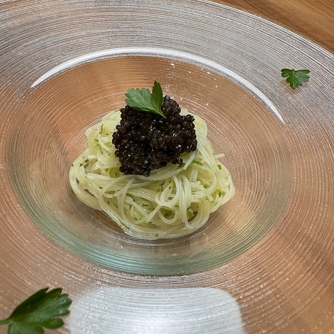 繊細なビーフンにフレッシュキャビアを贅沢に添えた一品。塩味と旨味の調和が生み出す奥深い味わいは、まさに「通」を唸らせる逸品です。盛岡でフレッシュキャビアを堪能できるのは、輝てるBOUZだけ。唯一無二の絶品味覚体験をぜひご堪能ください。