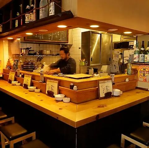 店内は落ち着いた照明と温もりのある木を基調とした、居心地の良い内観。席の構成は、料理人の手元を眺めながらお食事が楽しめるカウンター席と、少人数での会話が弾むテーブル席をバランスよく配置。お一人様での晩酌や、ご友人やご家族との和やかな食事、職場の仲間との大人数での宴会まで、幅広いシーンに対応できる規模感が魅力です。