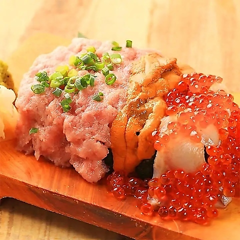 ここでしか味わえない豪快に寿司ネタを盛り付けた特製こぼれ寿司。いくら・うに・ネギトロ・刺身を巻き物が見えないほどこぼし盛り付けました。一見の価値あり!