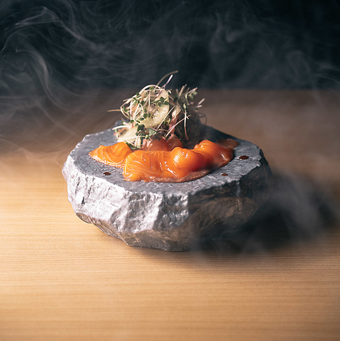 アトランティックサーモンを目の前で仕上げる瞬間燻製。豊かな脂の甘みとサーモン本来のうまみをそのままに、口に入れた瞬間にスモークの余韻が広がります。北海道ワイン・日本酒のお供等幅広くお楽しみいただけます。