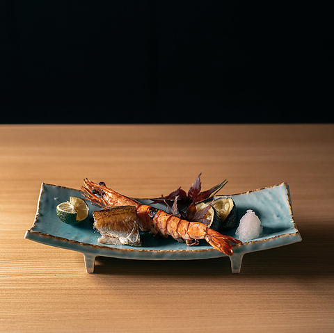 殻付きのまま豪快に焼き上げる原始焼きは、火の力で素材の旨味を最大限に閉じ込める、古来より受け継がれる調理法です。海老本来の甘みと香りを逃さず、外は香ばしく身はふっくらとした瑞々しさを保ちながら、炭火が生み出す柔らかな燻香が海老の甘さを引き立て、一口ごとに海の豊かさが広がります。