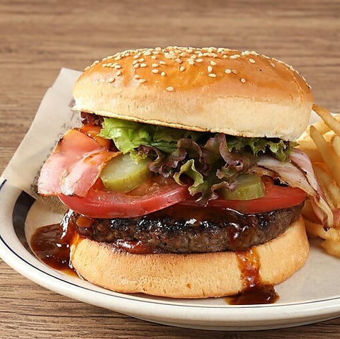 肉汁が溢れるビーフ100%パティのジューシーな肉感、香ばしいベーコン、新鮮な野菜が融合した極上の一品です♪ガブッと豪快にかぶりつくのがバベルスタイル!見た目も食べ応えもアメリカンな特製BIGバーガーをぜひご堪能くださいませ。他にも、前菜やサラダ、温菜、揚げ物、デザートなど豊富なメニューをご用意してお待ちしております!