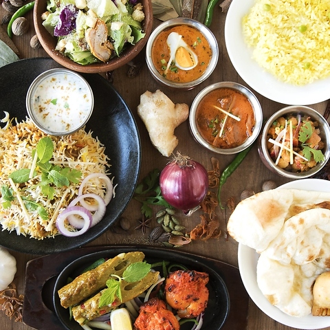 店内のあちこちにはインドの絵画や装飾品が飾られており、非日常空間を演出しております。お食事と共に、五感で楽しむひとときをお過ごしください。