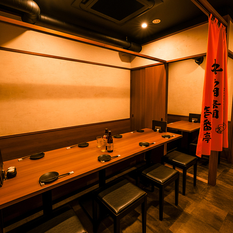 ロゴ入り暖簾が情緒を添えるテーブル席は、6名様から最大12名様での宴会に最適です。落ち着いた和モダンの空間ながら、暖簾で仕切られた半個室風の造りが、一体感とプライバシーを両立。選び抜かれた銘酒を酌み交わし、仲間と賑やかに逸品料理を愉しむ、活気あふれる宴のひとときをお過ごしください。
