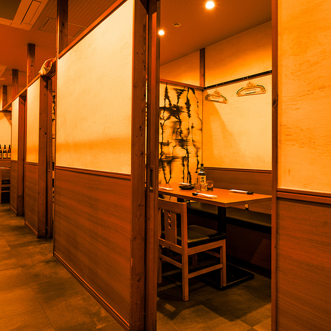 木の温もりと柔らかな照明が心地よい半個室。すりガラスの仕切りと暖簾で程よいプライベート感があり、落ち着いた雰囲気で会話と食事を楽しめます。