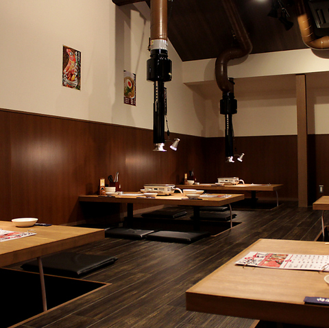 木目を基調とした落ち着いた雰囲気の店内には、テーブル席&ソファー席をご用意しております。広々とした造りで、ご家族やご友人との食事はもちろん、会社の飲み会にも最適です◎全席に排煙ダクトを完備しておりますので、煙や匂いを気にせず快適にお食事をお楽しみいただけます♪温かい照明が灯る、居心地の良い空間です。