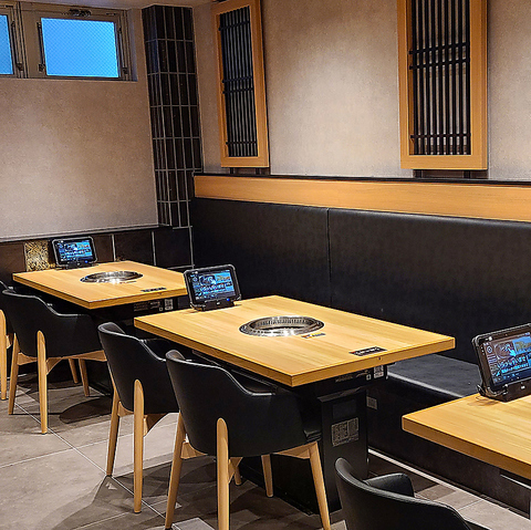 黒と木目を基調としたモダンな空間に、ゆったりとしたテーブル席を3卓ご用意。座り心地の良いチェアで、落ち着いてお食事を楽しめます。ご家族やご友人とのカジュアルな焼肉ディナーに最適です。タッチパネルでのスムーズな注文も可能で、賑やかな会話と共に美味しいお肉をご堪能ください。