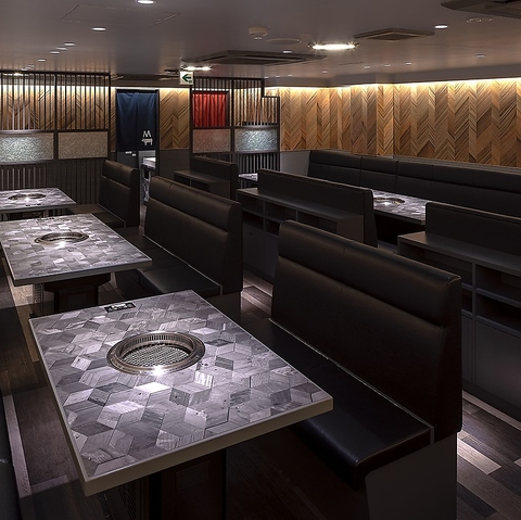 【モダンで上質な空間】 温かみのある木目調の壁と、六角形の模様が目を引くシックな石造りのテーブルが印象的な店内。間接照明が優しく照らすモダンな空間は、洗練された雰囲気です。大切な方とのお食事やデートにも最適な、落ち着いた上質な時間が楽しめます。