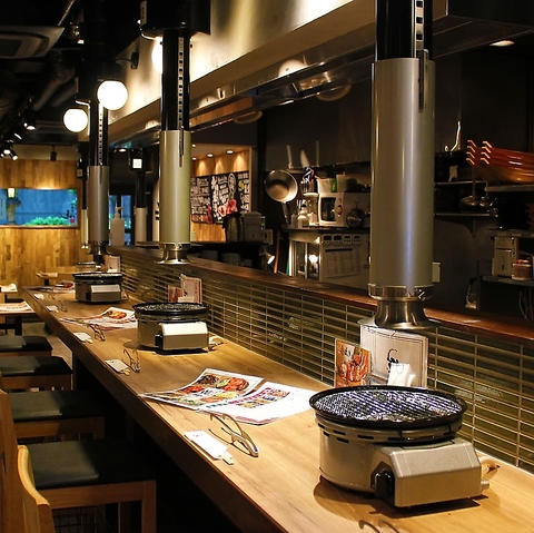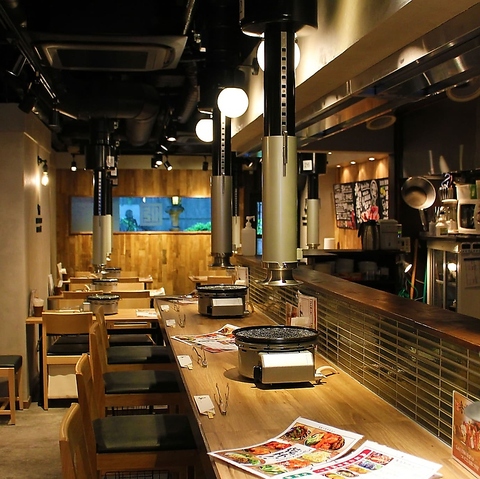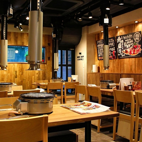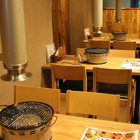壁やテーブル、椅子に至るまで木目調で統一し、温かみのあるナチュラルな空間を演出。明るく清潔感のある店内でゆったりとお寛ぎいただけます☆各テーブルには高性能ロースターと強力な排煙ダクトを完備。煙や匂いを気にせず快適に焼肉を楽しめるよう配慮しています。ご友人やご家族とのお食事に最適です。