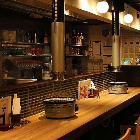 お一人様でも気軽に焼肉を楽しめる、広々とした木製のカウンター席。目の前にはキッチンのライブ感が広がります。カウンターの腰壁にはタイルをあしらい、木の温もりの中にモダンなアクセントをプラス◎丸い照明が柔らかく手元を照らします。各席にロースターと排煙ダクトを完備し、快適さにもこだわりました。