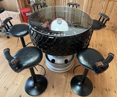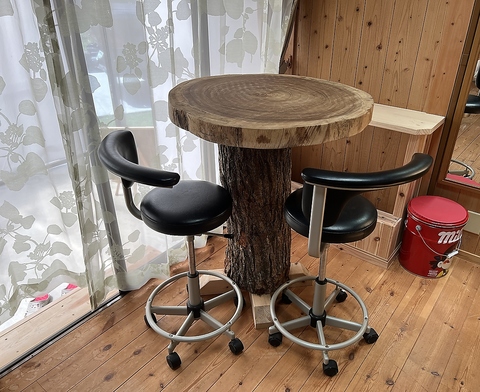 敷地内駐車場は滑りにくいコンクリート刷毛引き仕上げです。ツーリングがてらアフターランチのコーヒーブレイクに、気が向いたときにお立ち寄りいただけます。また、土間カウンター席からは停めた愛車を眺めながらコーヒーを楽しんでいただけます。写真のバイクは女性ライダーの店主が乗っているハーレーで2010年式ロードキングクラシックです