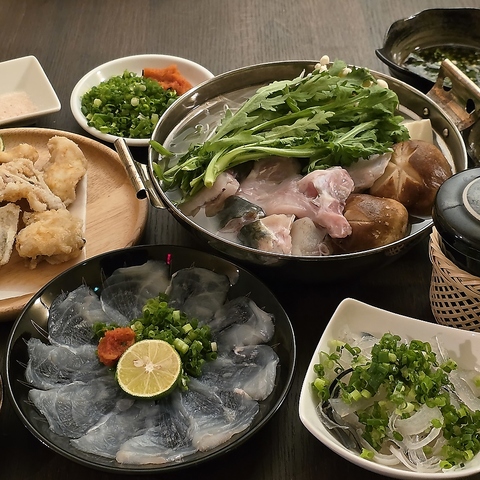 旬の味覚を詰め込んだ旬コースは、てっちり・てっぴ・てっき・唐揚げ・雑炊・香の物・デザートの全7品。冷凍を一切使わず、生きたふぐを店内で捌くからこその旨味と弾力を堪能できます。職人技が光る丁寧な仕立てと、目の前で繰り広げられるライブ感も魅力。五感で味わう季節のごちそうを心ゆくまでお楽しみください。