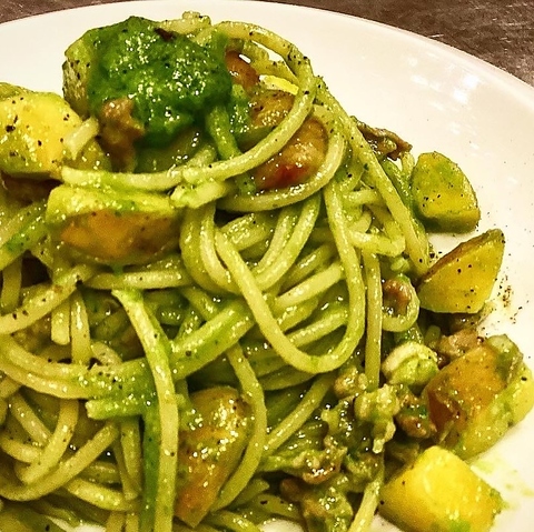 長糸産赤鶏とじゃがいもの菜の花ソースパスタ