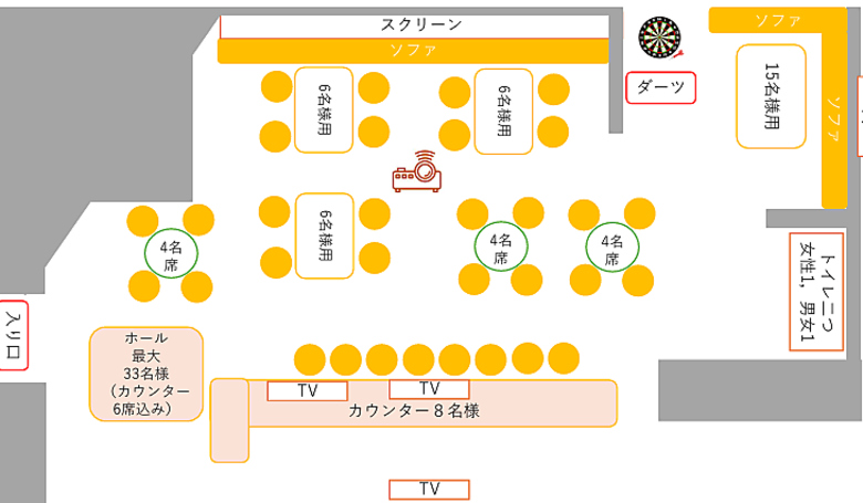 開放的で設備充実!大型スクリーンやダーツ完備で、宴会や2次会を自由に演出できます♪
