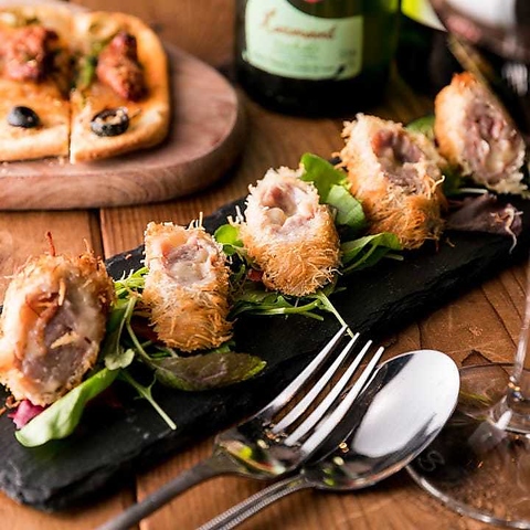 アンダルシア地方コルドバの名物「ロールカツ」をカダイフで巻いたメルカドオリジナル料理です。独特のサクサクした食感と、中の肉とチーズの旨味が詰まったお酒に合う一品です◎スペインワインと併せて是非ご賞味ください!ワインのご相談も可能ですのでお気軽にどうぞ♪