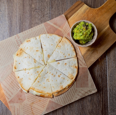 サクサクに焼き上げたトルティーヤの中から、とろ~りチーズがあふれる!まろやかアボカドソースで楽しむ、やみつきピザです