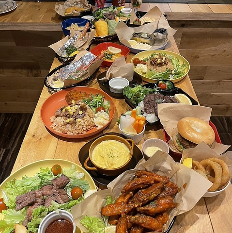 サラダ、お肉料理、ご飯もの、揚げ物など、多彩なメニューが勢揃い!誰もが好きな料理を見つけられる豊富なラインナップが自慢です。見た目も華やかな料理の数々は、パーティーシーンを盛り上げます。ボリューム満点で、みんなでシェアして楽しむのがおすすめ。