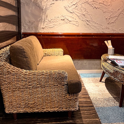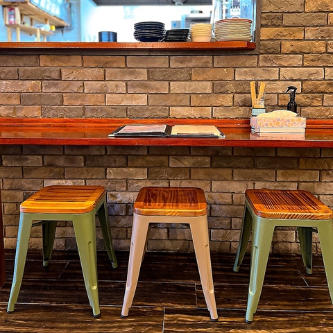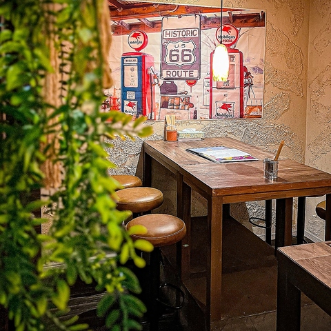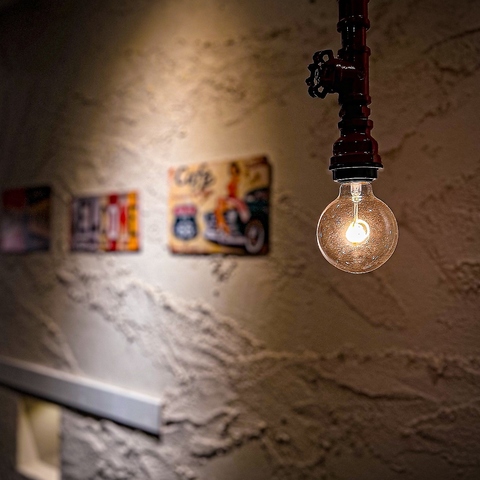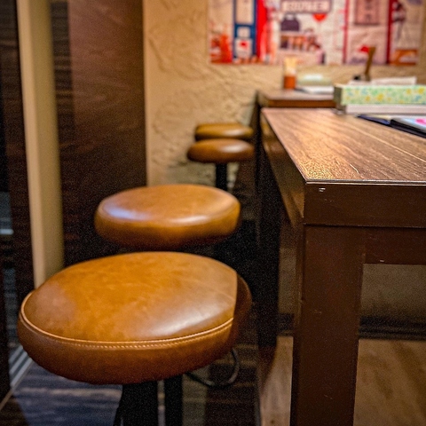 壁の質感が目を引く、モダンでカジュアルな空間です。大きなテーブル席があり、仲の良い仲間たちと賑やかに食事を楽しむのに最適です。おしゃれな間接照明と温かい色合いのペンダントライトが、リラックスできる雰囲気を演出します。気の合う友人との飲み会や、バル使いにぴったり