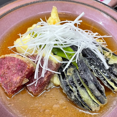 豆腐を丁寧に揚げ、旨みを閉じ込めました。香ばしい揚げ衣と、出汁の優しい味が絶妙に絡み合い、心温まる一皿になっております。お酒との相性も良く、ちょっとしたおつまみにも最適です。