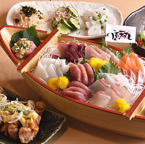 当店の自慢はなんといっても新鮮な海の幸!市場から仕入れるピチピチの魚介を使ったお刺身は絶品です。なかでも看板メニューの「超頂天舟盛り」は、見た目も豪華でボリューム満点!その日の選りすぐりのお刺身をドーンと舟盛りにしてご提供しており、宴会コースでも豪華な舟盛りをお楽しみいただけます◎