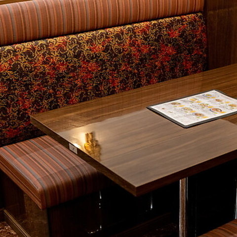 異国情緒あふれる店内には、広々としたテーブル席が多数ございます。特にソファ席になっているお席では、周りを気にせず、ゆっくりとお食事をお楽しみいただけます。お子様連れのご家族や、賑やかなご友人同士のカジュアルな食事シーンに最適です。広々とした空間で、本場インドやタイの料理を心ゆくまでご堪能ください。