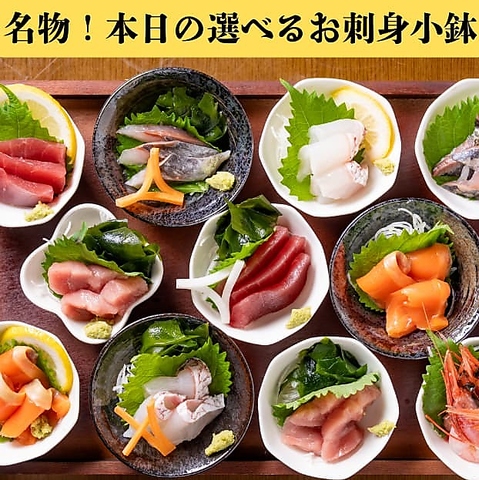 名物◎季節の鮮魚や鮪、海老、サーモンなど様々なお刺身を「選べる小鉢」でご用意しております!1品450円(税込)から、2品800円(税込)、3品1100円(税込)、5品なら1700円(税込)と、選ぶほどお得に♪その日の気分や人数に合わせて、お好みの組み合わせをお楽しみください!♪ 一人で贅沢に、皆でシェアしてもぴったりのサイズ感です!