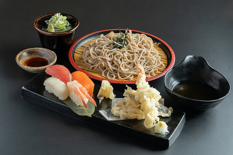 【一番人気】天婦羅・お寿司・お蕎麦の欲張りセット。麺はうどん・そば・温冷をえらべます。