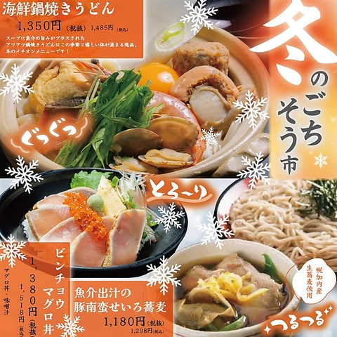 季節ごとに旬の食材を使用したメニューをお届けしております。この時期は冬の寒さに負けない、体の芯から温まるようなメニューになっております。自慢の生蕎麦も使用したメニューもありますので是非ご堪能ください!