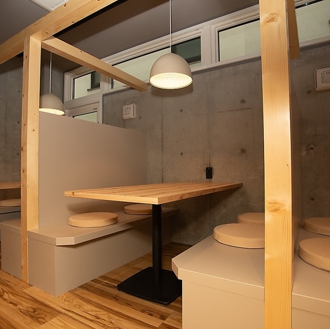 | テーブル | 4名様×4 | 木製のボックス席が並び、プライベート感と落ち着きのある空間を提供。丸いクッション付きで、座り心地にも配慮された設計。 |