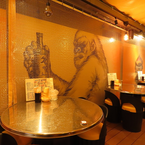 店内に一歩足を踏み入れれば、そこはまるで韓国の昔ながらのポジャンマチャ(屋台)!イエローをベースとした落ち着いた色調でありながら、壁にはお店のシンボルマーク であるゴリラの絵が描かれたユニークなデザインが施されています。レトロな鉄板と相まって、本場の熱気と活気を表現した雰囲気は、感動をもたらします。