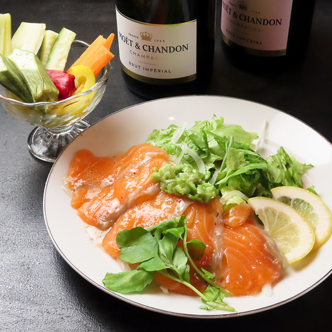 サーモンや鯛など、その時期に良い季節の魚介を厳選して贅沢に盛り合わせたカルパッチョです。さっぱりとした味わいは、ワインはもちろんお酒のおつまみに最適です。わさびが少しアクセントになり、魚介の旨味を引き立てます。ぜひ、お酒とのマリアージュをお楽しみください。その他、アラカルトメニューも充実♪