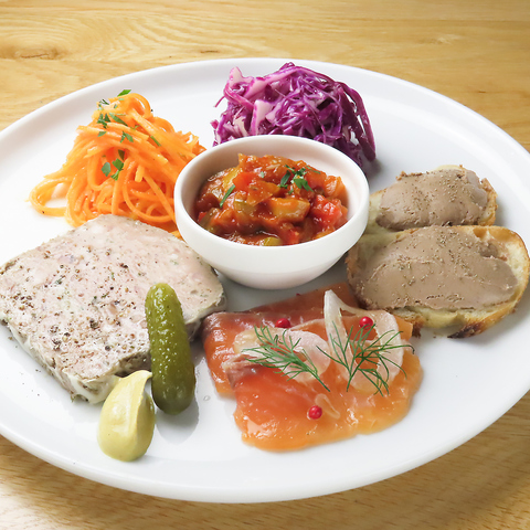 サーモンマリネやパテ・ド・カンパーニュなど、6種類の人気冷菜を盛り合わせにした贅沢な一皿。素材の持ち味を活かした丁寧な下処理が光ります。豊富なワインリストからぴったりの一杯を選んで、2人でシェアするのに最適。デートや女子会での会話も弾む、とっておきのメニューです。