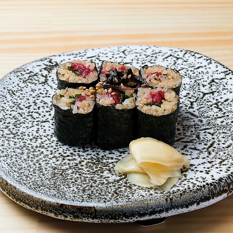 名物の細巻きは、赤酢飯ならではのまろやかな酸味と深いコクが特徴。厳選した米に赤酢を合わせ、丁寧に仕上げることで素材本来の旨みを引き立てます。シンプルな具材を細く巻き、口に運ぶたびに香りと余韻が広がる上品な味わい。食事の締めや酒肴にもふさわしい、通好みの逸品です。
